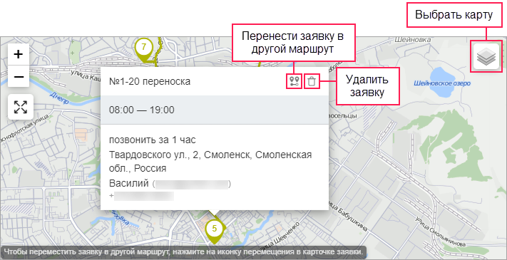 Вы также можете перенести заявку в другой маршрут на карте.