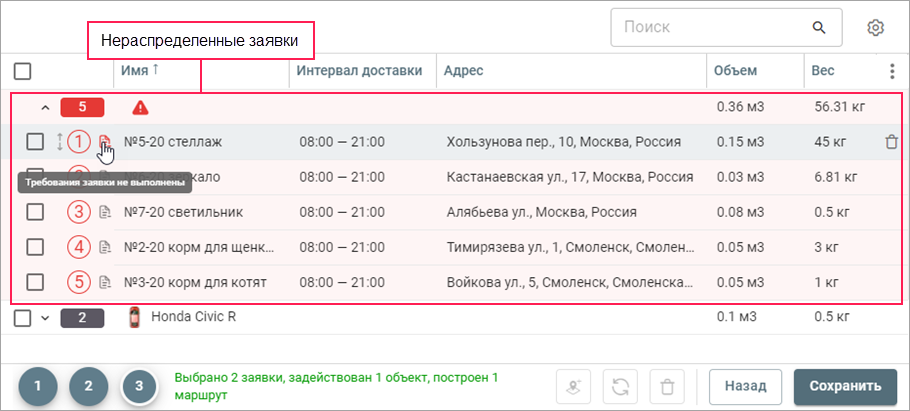 С исключенными заявками можно совершать все те же действия, что и с остальными заявками: перенос в другой маршрут (в таблице или на карте), удаление, создание нового маршрута и т. д.