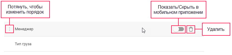 Чтобы произвольное поле показывалось в заявках в мобильном приложении, наведите курсор на строку с полем и активируйте переключатель.