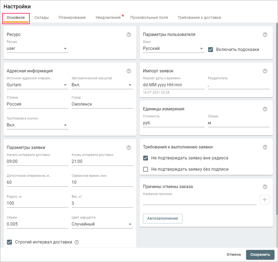На этой вкладке можно выбрать ресурс, единицы измерения, настроить карту и параметры заявок, которые должны показываться по умолчанию в окне заявки.