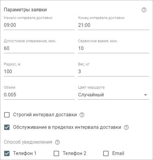 | Строгий интервал доставки | Опция, при включении которой маршрут планируется таким образом, чтобы не нарушать указанные интервалы доставки. |