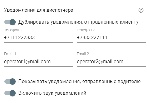 Для этого необходимо включить опцию Дублировать уведомления, отправленные клиенту и указать адрес электронной почты и/или телефонный номер диспетчера. Одновременно можно указать два адреса и два телефонных номера.