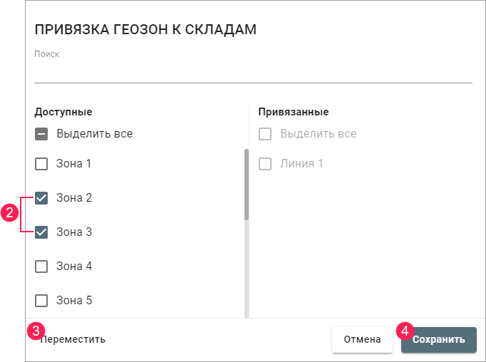 2. Найдите и отметьте геозону или геозоны, которые необходимо привязать к складу.