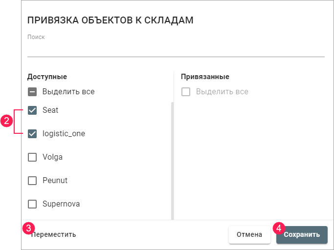 2. Найдите и отметьте объект или объекты, которые необходимо привязать к складу.