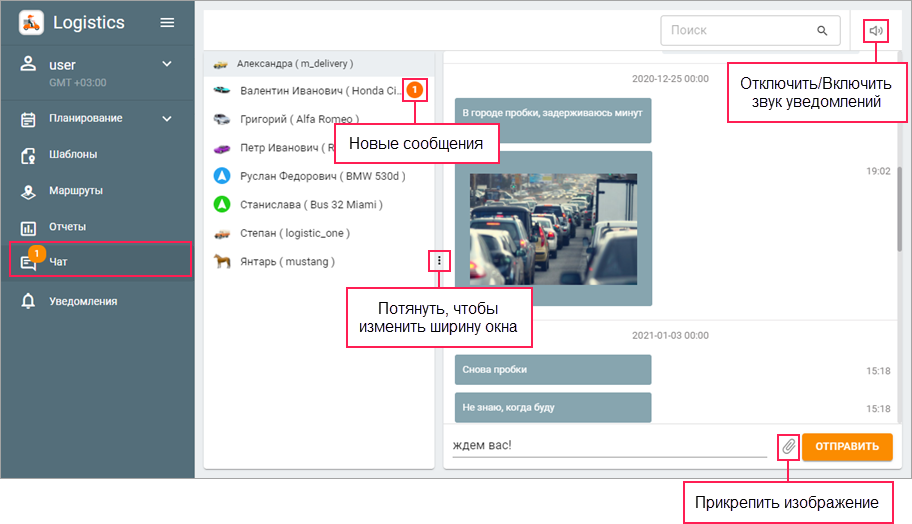 Эта страница предназначена для переписки с водителями. Кроме текстовых сообщений в чате можно получать и отправлять изображения.