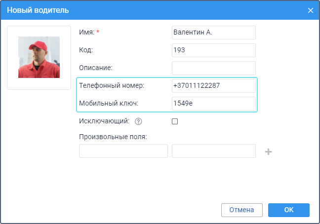В свойствах водителя заполните поля Телефонный номер и Мобильный ключ.