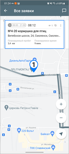 Чтобы проложить маршрут к точке доставки, можно воспользоваться сторонним приложением-навигатором. Для этого нажмите на ее маркер и удерживайте, после чего откроется меню с выбором приложений, если они есть. Также это можно сделать из списка заявок, нажав на иконку