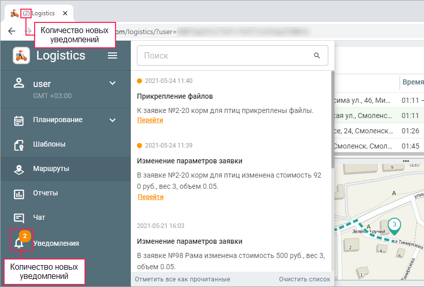 Новые уведомления отмечены оранжевым маркером. После нажатия на кнопку Перейти происходит переход на страницу Маршруты, где цветом отмечен маршрут или заявка из уведомления. Если маршрут или заявка уже находятся в истории, то в уведомлении для них нет кнопки Перейти.