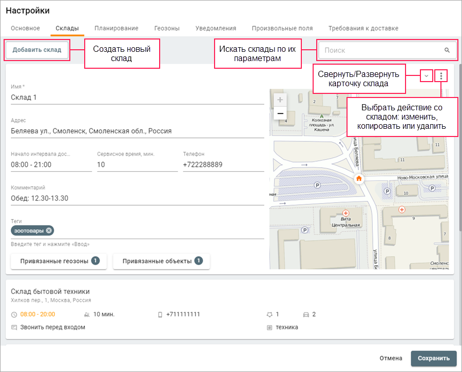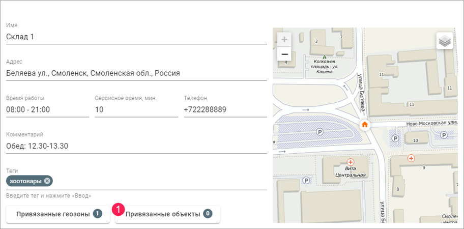 Вы можете привязать к складу одну или несколько геозон, добавленных на одноименную вкладку. На первом этапе планирования это позволяет сортировать заявки по геозонам.