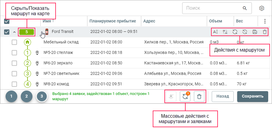 Чтобы развернуть маршрут и увидеть заявки, из которых он состоит, используйте иконку