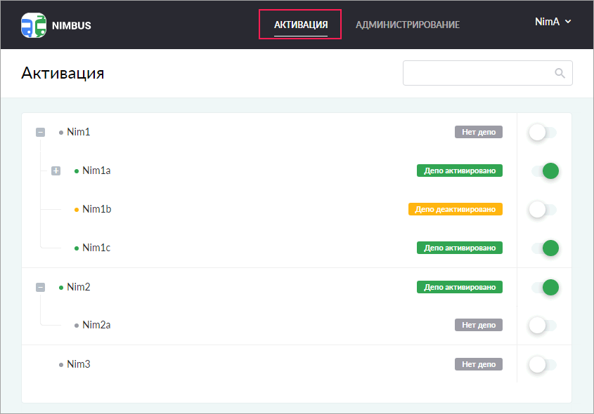 На странице Активация представлен список учетных записей, для которых можно активировать/деактивировать депо, используя переключатели напротив их имен. Слева от переключателя указывается статус депо (активировано/деактивировано). Если депо для учетной записи еще не создано, напротив ее имени показывается надпись Нет депо. Для удобства поиска необходимой учетной записи в правом верхнем углу страницы находится динамический фильтр.