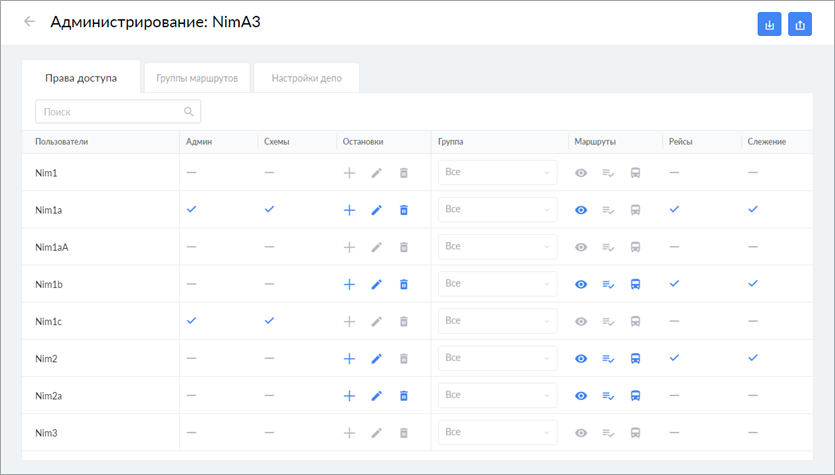 По умолчанию права даются на все маршруты депо. Тем не менее, их можно ограничить рамками одной группы маршрутов. Для этого необходимо выбрать ее в колонке Группа.