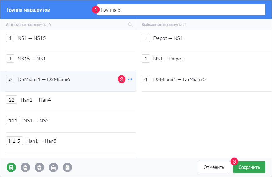 , которая показывается в конце строки с маршрутом по наведении на нее курсора мыши. Для удобства поиска необходимых маршрутов можно использовать фильтрацию по типу транспорта в нижней левой части диалогового окна и динамический фильтр, расположенный над списком. Для того чтобы удалить маршрут из списка справа, используйте кнопку, которая показывается в конце строки с маршрутом по наведении на нее курсора мыши (