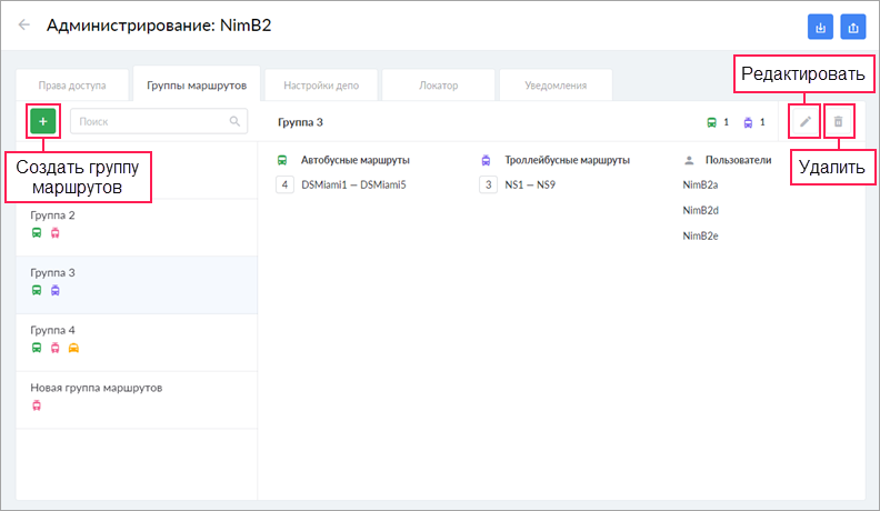 Слева показывается список групп маршрутов. Нажатием на группу открывается подробная информация о ней в правой части окна: имя, список маршрутов по типам транспорта, список пользователей, имеющих доступ к группе. Над списком имеющихся групп находится динамический поиск.