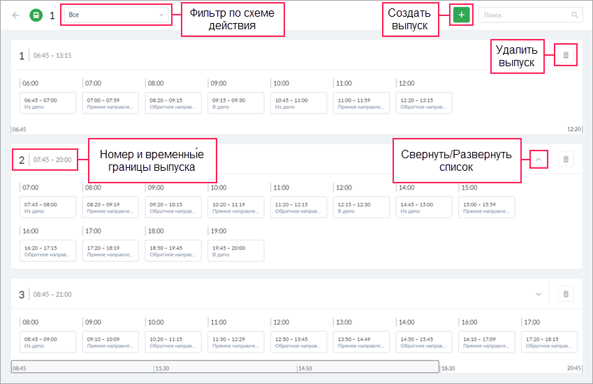 Справа от номера выпуска показывается время его начала и окончания (от первой точки первого расписания до последней точки последнего).