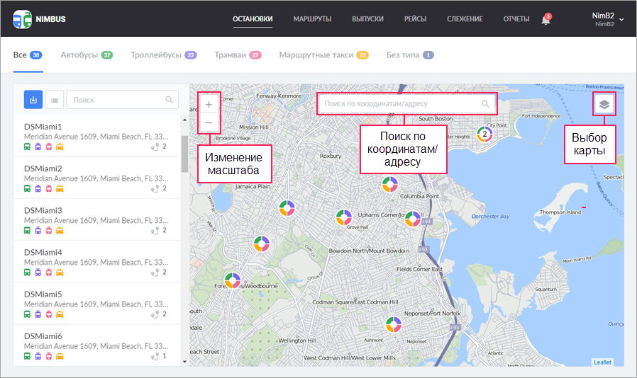 Карта доступна на страницах Остановки, Маршруты, Слежение, Отчеты и занимает на них бóльшую часть экрана.
