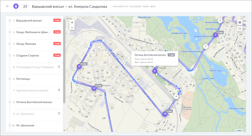 - Во всплывающей подсказке к остановке можно увидеть ее имя и планируемое время прибытия. Для посещенной остановки также указывается фактическое время прибытия и то, с каким опережением или отставанием она была посещена.
