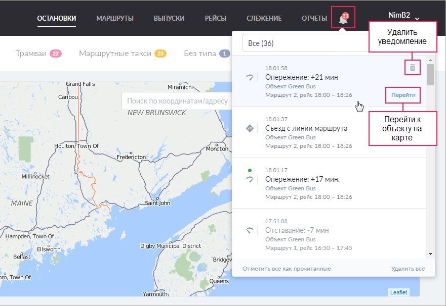 Непрочитанное уведомление отмечается зеленым индикатором. Если рейс уже завершился, текст уведомления становится бледно-серым. Щелкните по уведомлению чтобы отметить его как прочитанное. Чтобы не делать это для каждого уведомления отдельно, можно воспользоваться кнопкой Отметить все как прочитанные внизу окна. Там же расположена кнопка удаления всех уведомлений из списка. Для удаления конкретного уведомления, наведите на него курсор мыши и нажмите на иконку