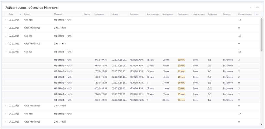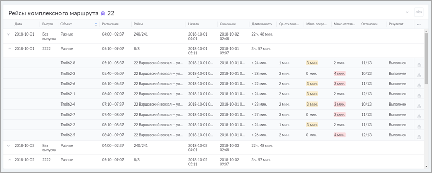 | Выпуск | Номер выпуска. Если рейсы объекта относятся к разным выпускам, в колонке пишется Разные. Если не относятся ни к какому, колонка остается пустой. |