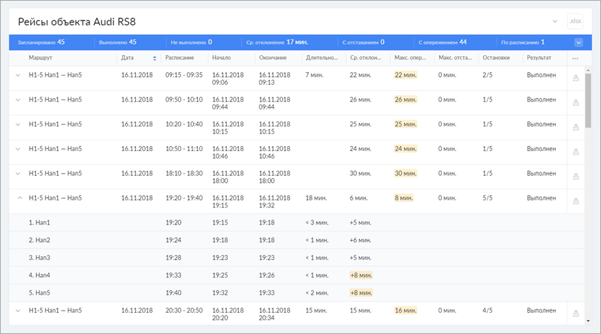 Детализированная версия отчета дает возможность получить подробную информацию по каждому посещению остановки: запланированное время посещения, фактическое время входа, фактическое время выхода, длительность нахождения на остановке, фактическое отклонение от расписания («плюс» — опережение, «минус» — опоздание). В случае пропуска точки, во всех этих полях (кроме запланированного времени посещения) ставятся прочерки.