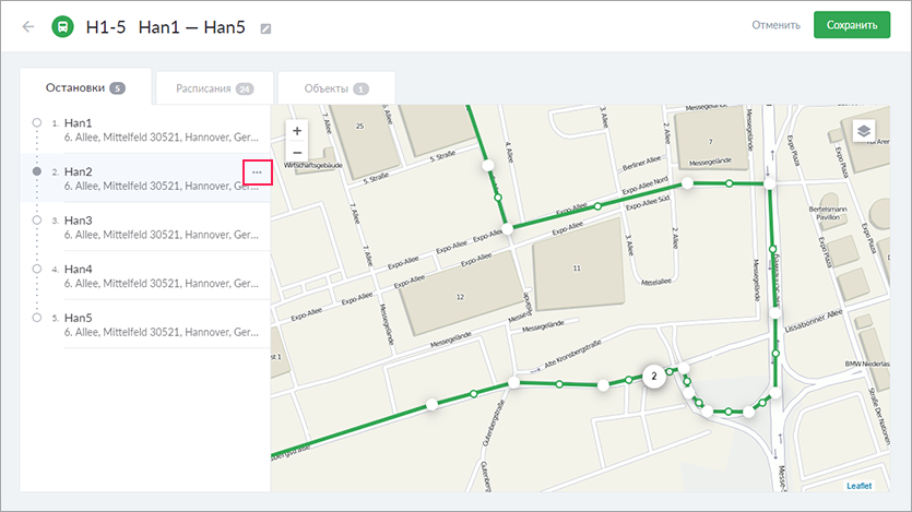Порядок следования остановок в списке можно менять, перетаскивая их на нужную позицию. В результате меняется линия маршрута на карте. При наведении курсора на строку с остановкой, показывается иконка в форме многоточия, которая позволяет открыть дополнительное меню действий.