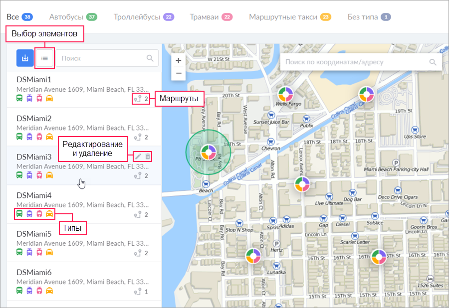 Чтобы быстро переместиться к остановке на карте, щелкните по ней в списке. На карте остановка показывается в виде круглой иконки, цветá которой соответствуют выбранным видам транспорта. Во всплывающей подсказке можно увидеть имя и описание остановки, а после нажатия на ее иконку показываются кнопки редактирования и удаления. Для остановки, которая находится в фокусе, также показывается форма.