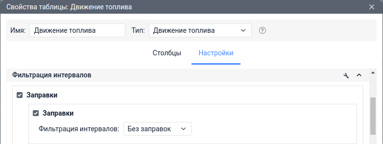 - Чтобы скрыть заправки топливозаправщика, в фильтрации интервалов раскрываем блок Заправки, в нем включаем фильтр Заправки и в выпадающем меню выбираем вариант Без заправок.