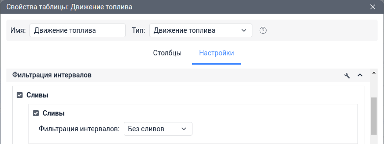 Чтобы скрыть сливы топливозаправщика, в фильтрации интервалов раскрываем блок Сливы, в нем включаем фильтр Сливы и в выпадающем меню выбираем вариант Без сливов.