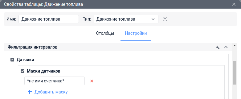 Чтобы скрыть показания этих счетчиков, в фильтрации интервалов раскрываем блок Датчики, в нем включаем фильтр Маски датчиков и указываем имя, которое не соответствует именам счетчиков.