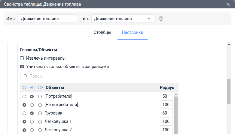 Если в настройках таблицы включена опция Учитывать только объекты с заправками, то объекты без заправок будут исключены из дальнейшего анализа и отображения. А если данная опция выключена, то в отчет попадут даже те объекты, которые просто находились рядом с топливозаправщиком в момент топливных активностей, но при этом не имели заправок. Предположим, что в рассматриваемом примере опция Учитывать только объекты с заправками включена.
