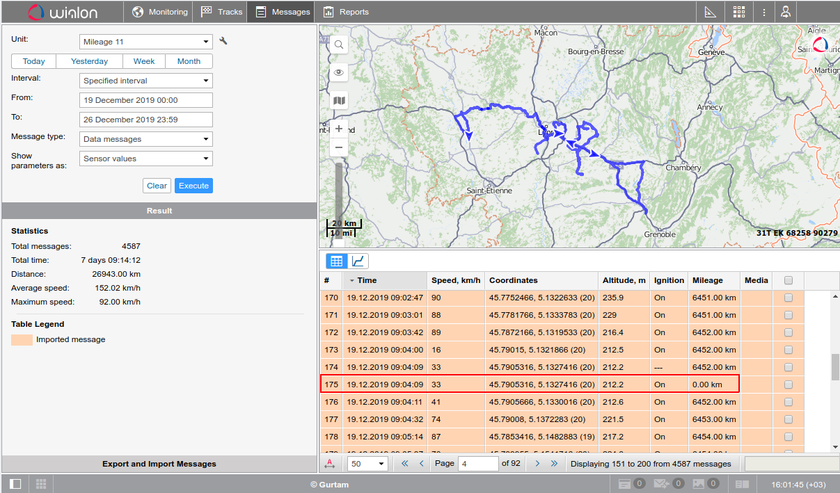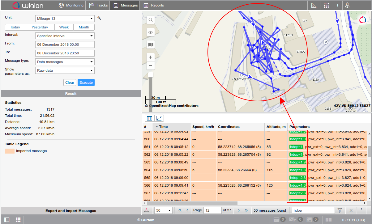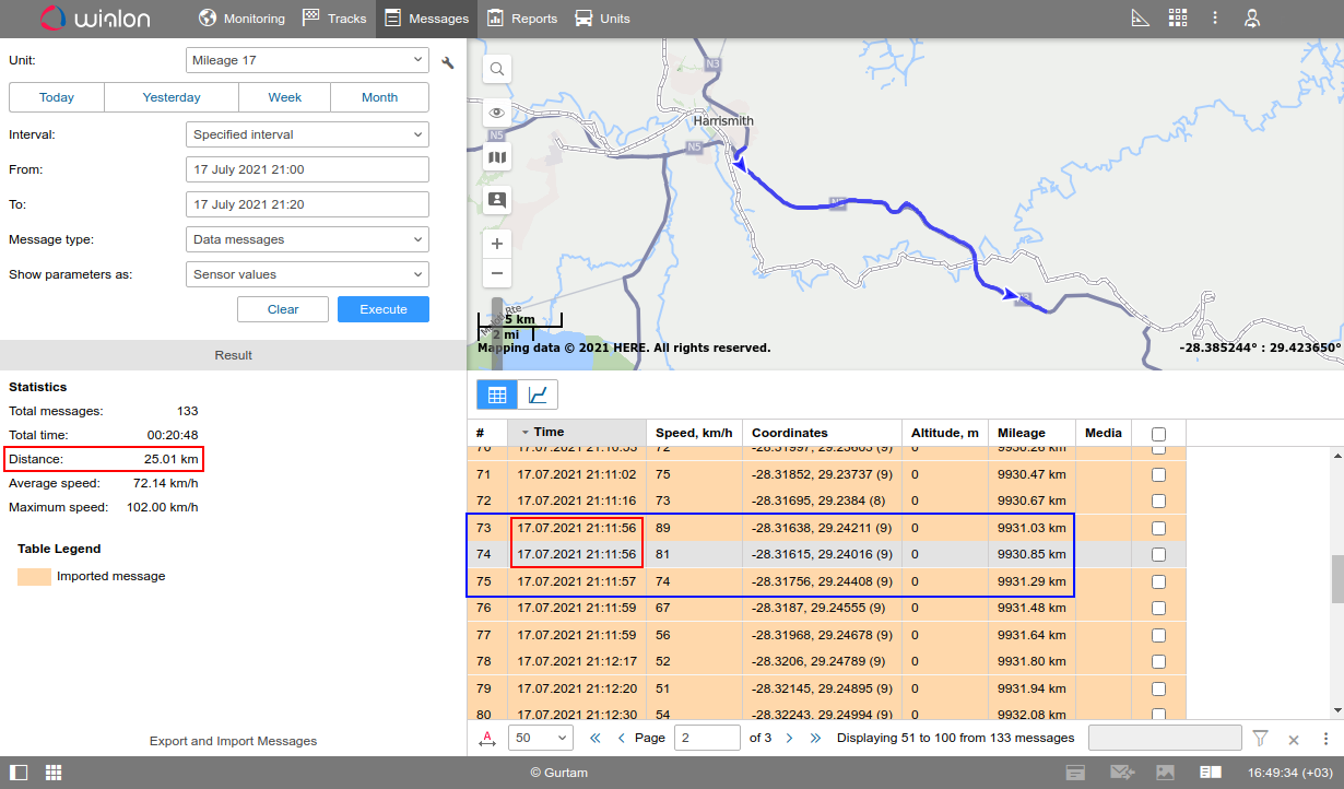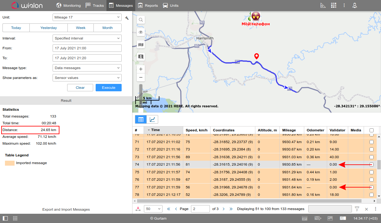 В целом, на картинке выше, пробег выглядит корректным — 25.01 км, в отличие от предыдущего примера, где ошибка была очевидна. Однако, если взять из сообщений начальное значение датчика пробега на интервале — 9917.81 км и конечное — 9942.44 км, вычесть разницу, то получим пробег — 24.63 км.