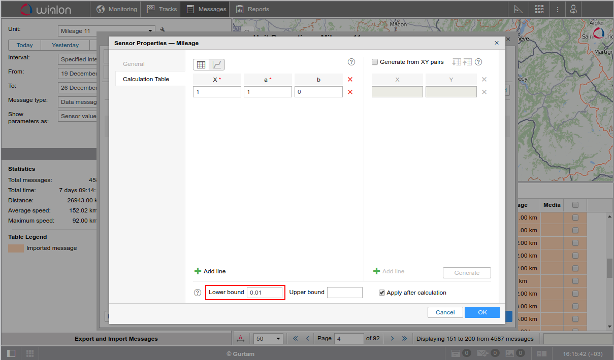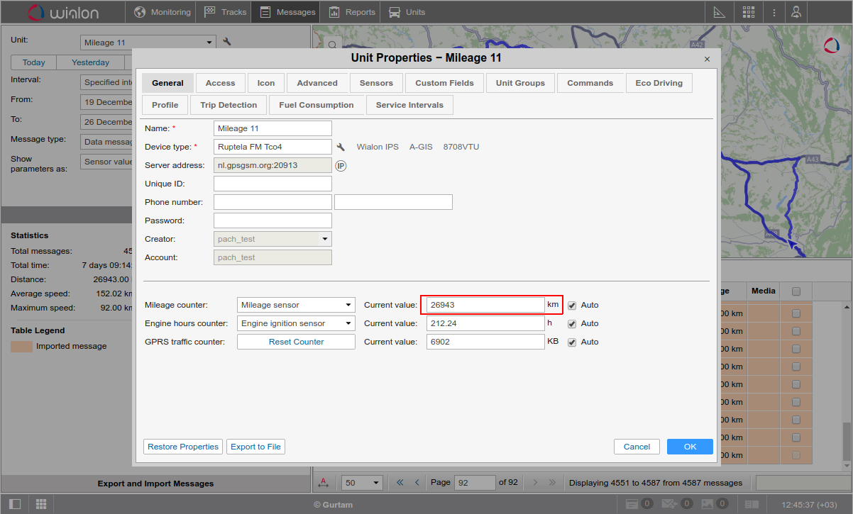 В примере выше удалось получить более корректные значения пробега с помощью перевода датчика пробега на тип Относительный одометр с добавлением валидации. Датчика относительного одометра основан на параметре в виде выражения: mileage-#mileage. Валидатор основан на параметре в виде выражения: time-#time. Нижняя граница для валидатора — 0, a тип валидации — Проверка на неравенство нулю. Счетчик пробега во вкладке Основное переключен на — Относительный одометр.