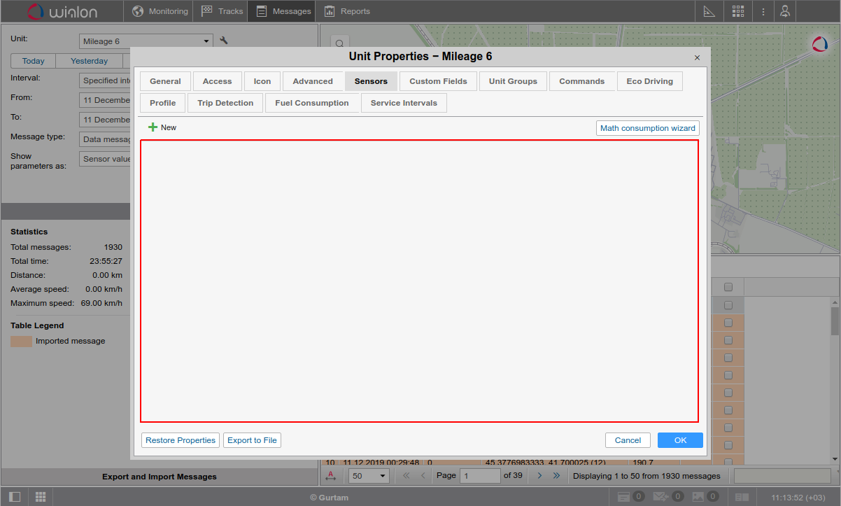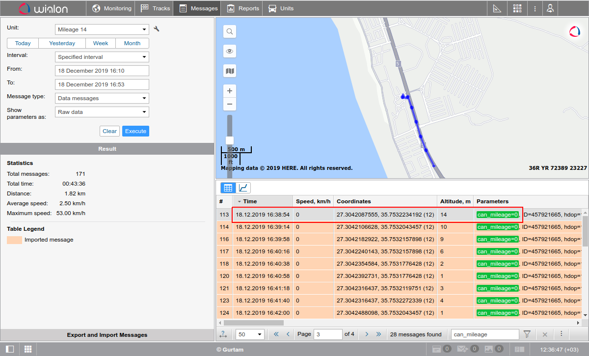В данном примере для объекта создан датчик пробега на основе параметра can_mileage, который отсутствует в сообщениях вплоть до 18.12.2019 16:38:54: