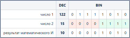 Например, результат математического И между числами 122 и 15 будет иметь следующий вид: