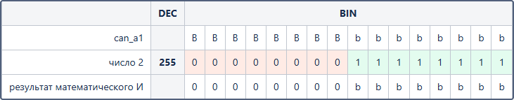 В итоге с помощью двоичного представления числа 255 была осуществлена фильтрация параметра can_a1 таким образом, чтобы оставить в нем только младшие 8 битов.