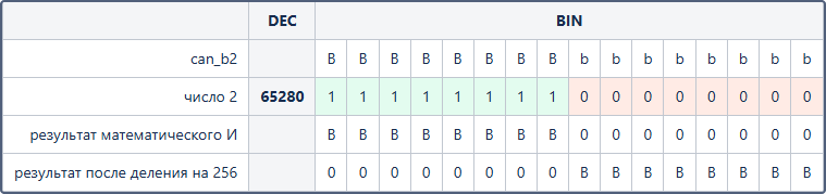 В итоге с помощью двоичного представления числа 65280 была осуществлена фильтрация параметра can_b2 таким образом, чтобы оставить в нем только старшие 8 битов, а потом они были превращены в младшие биты с помощью смещения.