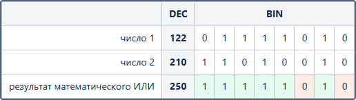 Например, результат математического ИЛИ между числами 122 и 210 будет иметь следующий вид: