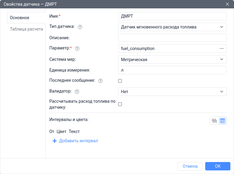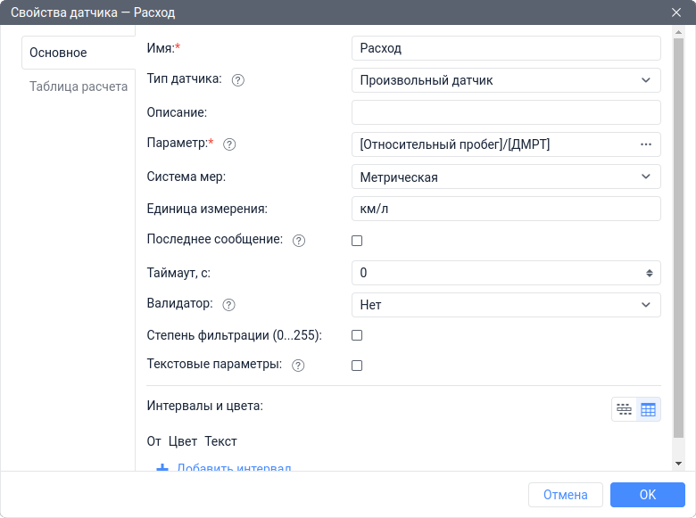 Создать Произвольный датчик с именем Расход и единицами измерения км/л. В качестве параметра указать odometer. В свойствах датчика Расход указать датчик ДМРТ в качестве валидатора и выбрать тип валидации Делить датчик на валидатор.
