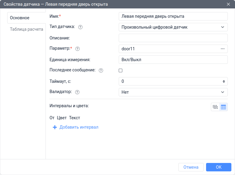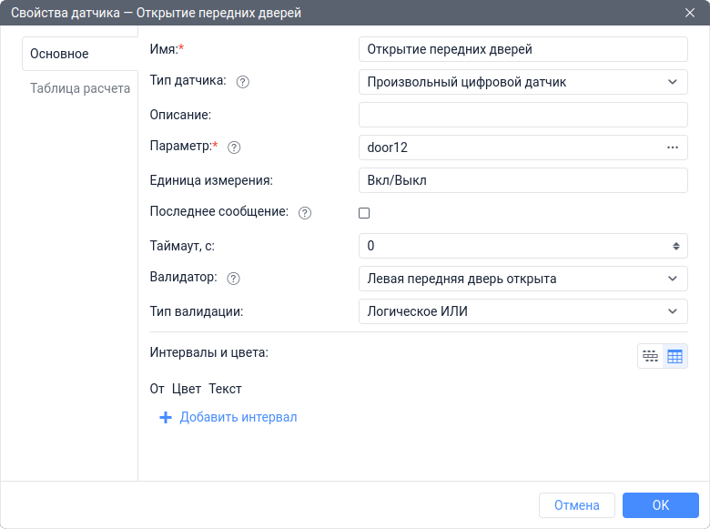 Создать Произвольный цифровой датчик с именем Открытие передних дверей, основанный на параметре door12. Далее указать датчик Левая передняя дверь открыта в качестве валидатора и выбрать тип валидации Логическое ИЛИ.