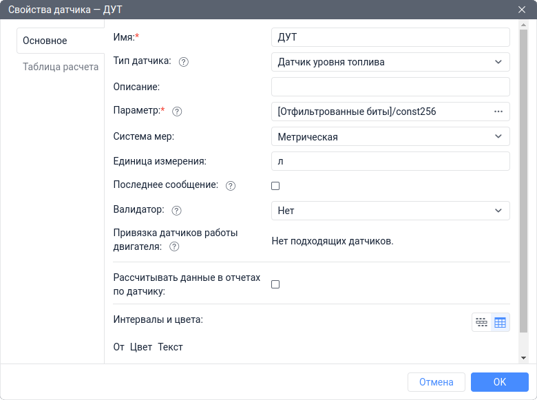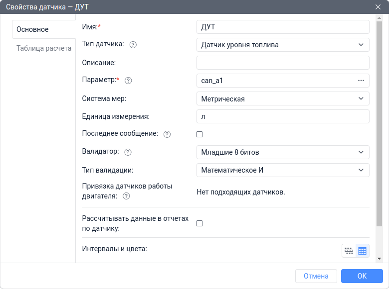 Создать Датчик уровня топлива с именем ДУТ на основе параметра can_a1. Далее выбрать датчик Младшие 8 битов в качестве валидатора и выбрать тип валидации Математическое И. Также в таблицу расчета датчика необходимо внести тарировочную таблицу для конвертации результата в литры.