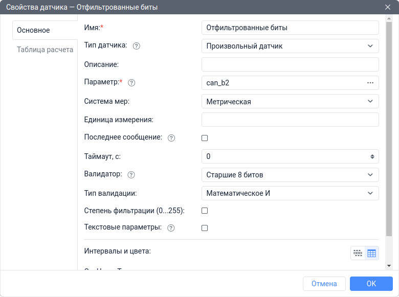 Создать Произвольный датчик с именем Отфильтрованные биты на основе параметра can_b2. Далее выбрать датчик Старшие 8 битов в качестве валидатора и выбрать тип валидации Математическое И.