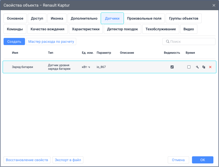 Результат: Созданный датчик показывается на вкладке Датчики свойств объекта. Далее вы можете использовать его для отображения текущего заряда батареи, создания уведомлений и подготовки отчетов.