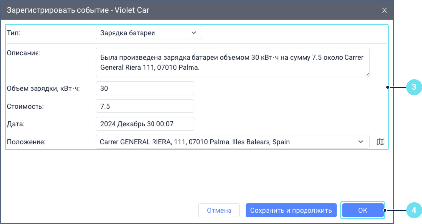 В окне выберите тип Зарядка батареи, укажите объем и стоимость зарядки, а также местоположение во время зарядки. Поля Описание и Дата заполняются автоматически, но их можно редактировать, если необходимо.