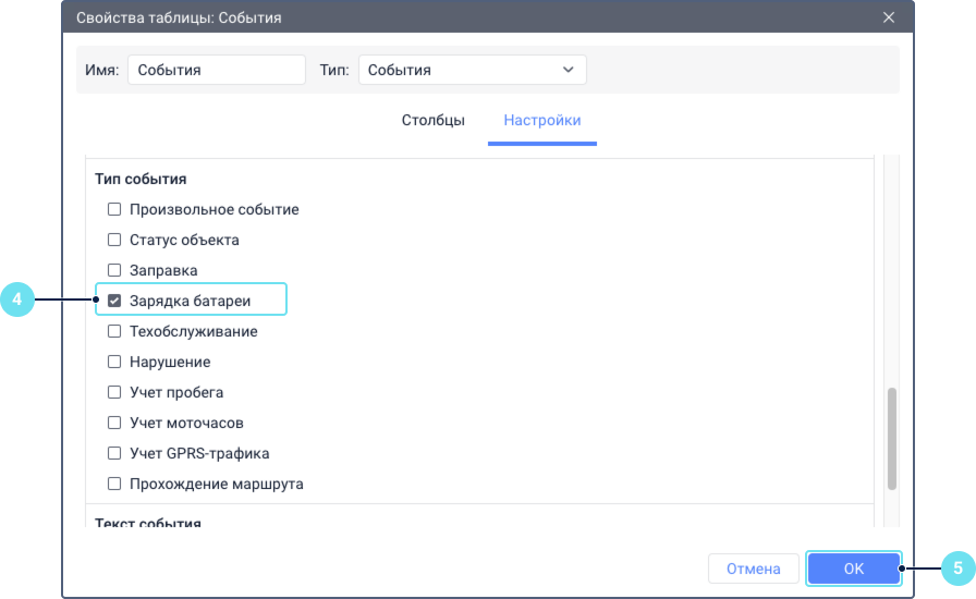 Чтобы увидеть данные о зарядке в таблице События, сделайте следующее: