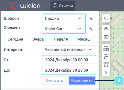 На вкладке Отчеты выберите созданный шаблон, нужный объект и период времени, а затем нажмите Выполнить.