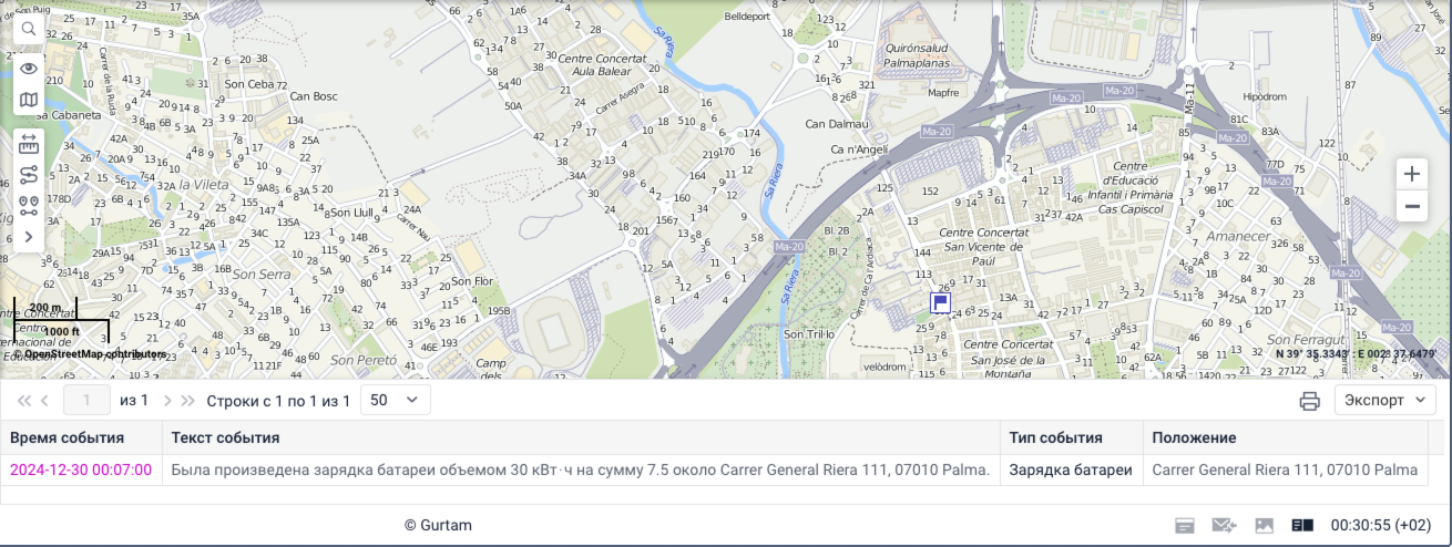 Результат: В рабочей области показывается таблица с данными о зарядках батареи и карта с маркерами, показывающими места зарядки.