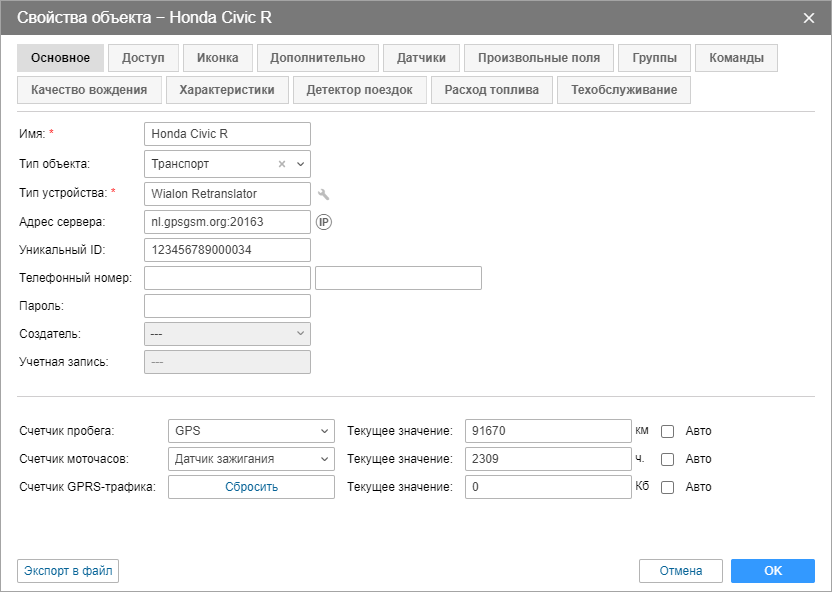 Перейдите на вкладку Характеристики и в поле Регистрационный знак укажите такой же номер, как при регистрации в системе HU-GO. Нажмите ОК.