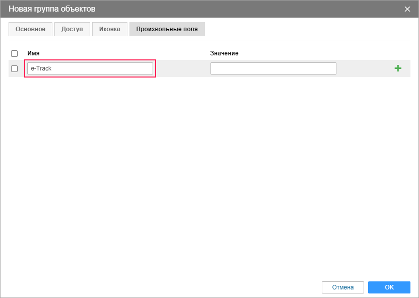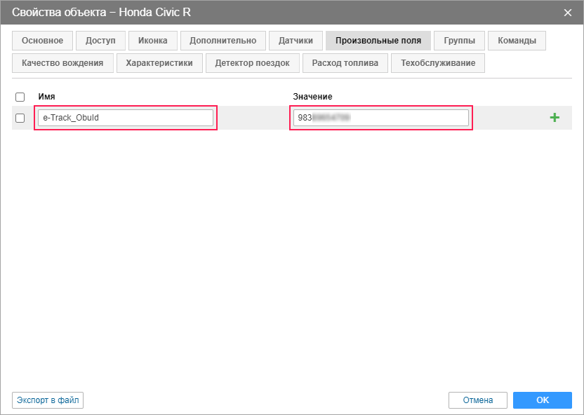 - Перейдите на вкладку Произвольные поля и добавьте произвольное поле с именем e-Track_ObuId. В поле Значение укажите идентификатор бортового устройства (OBU ID), полученный после регистрации на платформе e-track.