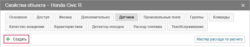 Перейдите на вкладку Датчики и нажмите на Создать. Если у объекта уже создан датчик зажигания, пропустите этот и следующий шаги.