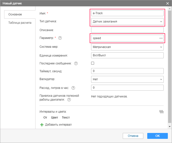Введите имя датчика и выберите тип Датчик зажигания. Если у объекта нет подключенного датчика зажигания, в поле Параметр укажите speed. Если датчик зажигания подключен, укажите параметр, отвечающий за зажигание.